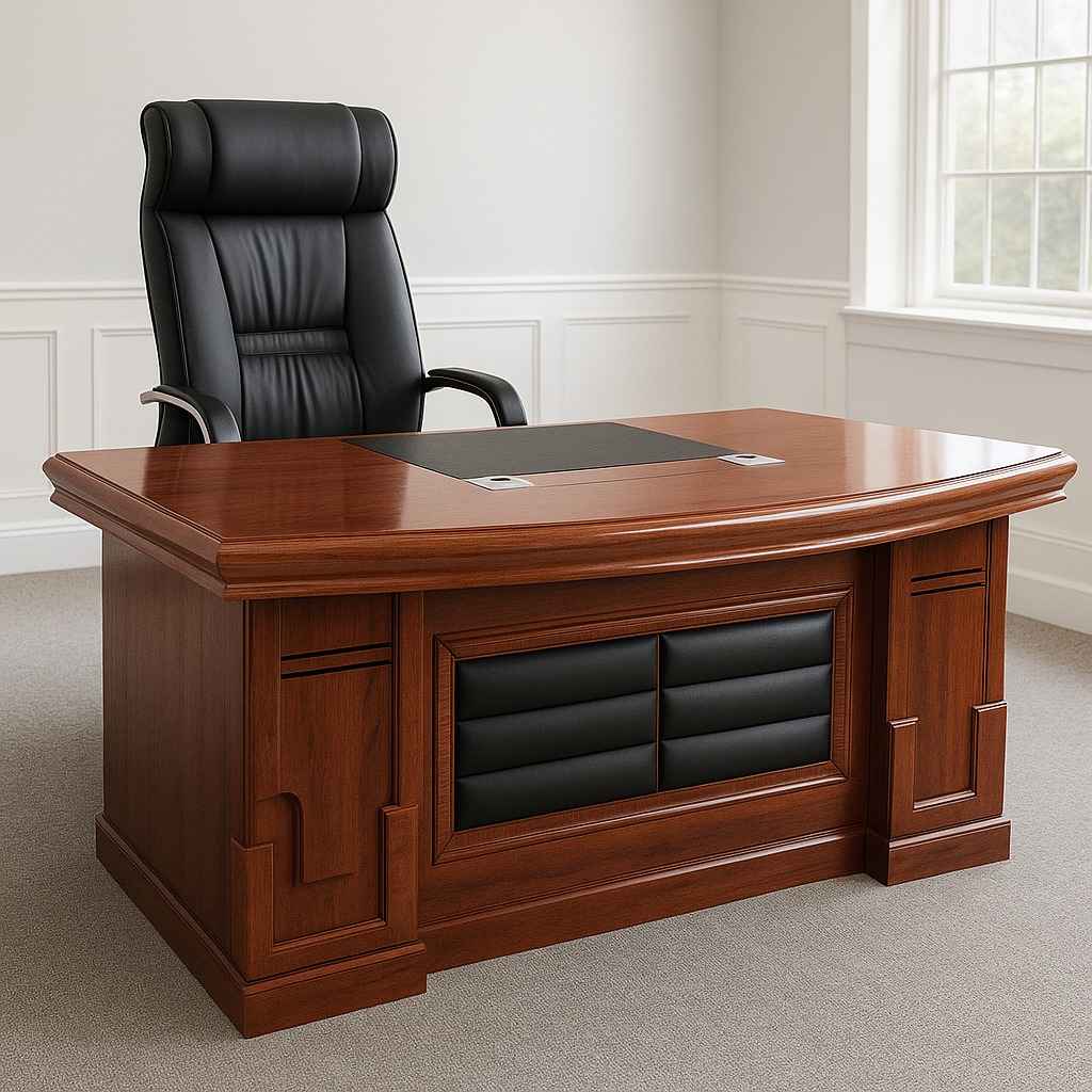 The desk’s deep red-brown tone is accented by a lustrous mahogany gloss, giving it a luxurious sheen that catches the light yet remains dignified rather than flashy. Whether placed in a bright corner office or a more muted boardroom, its polished surface commands attention. The finish is carefully applied and sealed to resist minor spills, wear, and scuffs typical in day-to-day use, helping it retain its elegant look over years of service.
